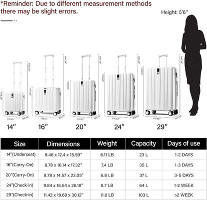 • [제품 크기]기동 저장 2 조각 세트 20/29 인치. 바퀴와 손잡이 포함 (확장 가능), 20 인치 항공 승인을 받은 수하물 운송: L13.46 x W8.78 x H21.46", 37L, 6.8LB,오버헤드 빈에 들어갈 수 있습니다.: 29 인치 체크인 가구 항공사 승인: L19.69 x W11.42 x H30.12 ", 103L, 11LB.